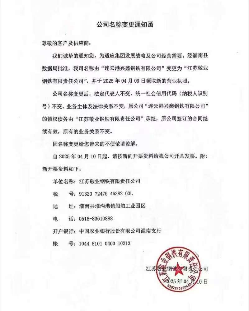 我們誠(chéng)摯的通知您,為適應(yīng)集團(tuán)發(fā)展戰(zhàn)略及公司經(jīng)營(yíng)需要。經(jīng)灌南縣數(shù)據(jù)局批準(zhǔn),我司名稱由“連云港興鑫鋼鐵有限公司”變更為“江蘇敬業(yè)鋼鐵有限責(zé)任公司”,并于2025年04月09日領(lǐng)取新的營(yíng)業(yè)執(zhí)照。