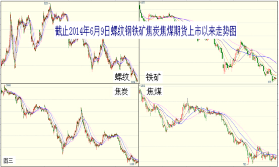 對于粗鋼增速的大幅回調(diào),鋼鐵原料市場反映強(qiáng)烈:63.5%印度粉礦1月2日報(bào)價(jià)135.5美元/噸,到6月9日報(bào)95.75美元/噸,跌39.75美元/噸,跌幅29.3%;國內(nèi)礦1月2日報(bào)1060元,6月9日報(bào)890元/噸,跌170元/噸,跌16%;焦炭1月2日報(bào)1400元,6月9日報(bào)950元/噸,跌450元/噸,跌32%;煤炭1月2日報(bào)850元,6月9日報(bào)690元/噸,跌160元/噸,跌18.8%。與此同時(shí),相應(yīng)期貨市場更是劇烈震蕩,3月、4月份間,礦、煤、焦甚至出現(xiàn)兩度跌停,數(shù)次盤中跌停的事件,疊創(chuàng)歷史新低。充分反映出市場對新常態(tài)經(jīng)濟(jì)形勢下,鋼鐵供需及其冶金原料價(jià)格將明顯下調(diào)的預(yù)期(見圖三)。