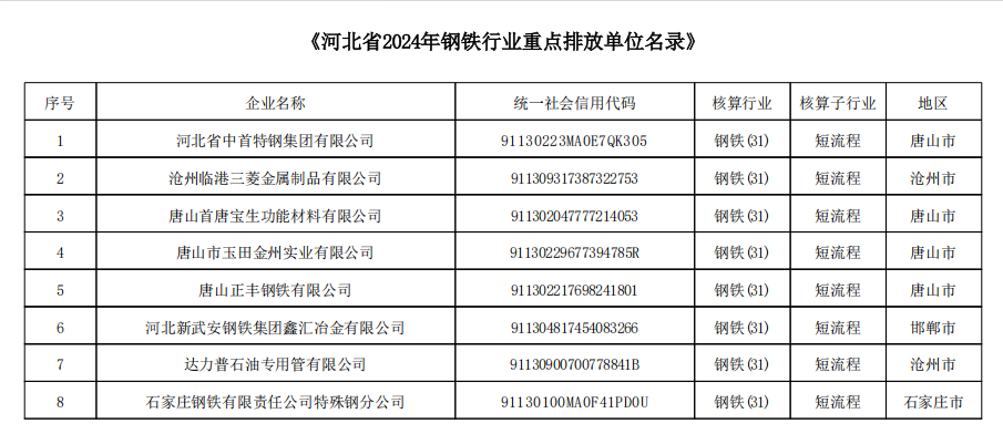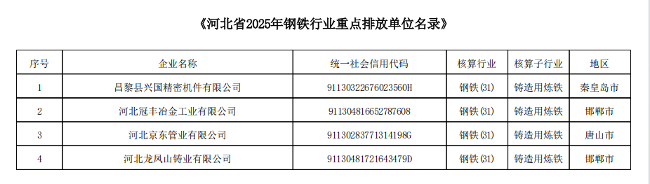 根據(jù)《碳排放權(quán)交易管理暫行條例》《生態(tài)環(huán)境部辦公廳關(guān)于做好2025年全國碳排放權(quán)交易市場有關(guān)工作的通知》(環(huán)辦氣候函〔2025〕140號)有關(guān)規(guī)定,現(xiàn)將河北省2024、2025年度納入全國碳排放權(quán)交易市場鋼鐵、水泥、有色金屬行業(yè)重點排放單位名錄公布如下(詳見附件)。