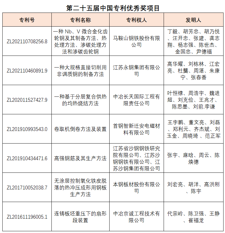 7個(gè)鋼鐵項(xiàng)目獲第二十五屆中國專利獎!