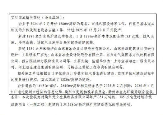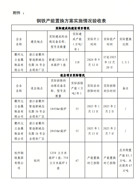 根據(jù)工業(yè)和信息化部《關(guān)于印發(fā)鋼鐵行業(yè)產(chǎn)能置換實(shí)施辦法的通知》(工信部原〔2021〕46號(hào))、浙江省經(jīng)濟(jì)和信息化廳《關(guān)于印發(fā)浙江省部分產(chǎn)能嚴(yán)重過剩行業(yè)產(chǎn)能置換實(shí)施細(xì)則的通知》(浙經(jīng)信材料〔2023〕105號(hào))及浙江省經(jīng)濟(jì)和信息化廳《關(guān)于確認(rèn)衢州元立金屬制品有限公司年產(chǎn)354萬噸鐵、345萬噸優(yōu)特鋼升級(jí)改造產(chǎn)能置換項(xiàng)目方案的函》(浙經(jīng)信材料便函〔2023〕82號(hào))等相關(guān)文件要求,經(jīng)企業(yè)申請(qǐng),衢州市經(jīng)濟(jì)和信息化局于2025年7月16日組織衢州市發(fā)展和改革委員會(huì)、衢州市生態(tài)環(huán)境局、衢州智造新城管委會(huì)及鋼鐵冶煉行業(yè)專家,對(duì)衢州元立金屬制品有限公司年產(chǎn)354萬噸鐵、345萬噸優(yōu)特鋼升級(jí)改造項(xiàng)目(一期工程)新建1座1280m³高爐投產(chǎn)前的建設(shè)情況進(jìn)行現(xiàn)場(chǎng)驗(yàn)收。現(xiàn)將驗(yàn)收情況予以公示,如對(duì)公示內(nèi)容有異議,請(qǐng)?jiān)诠酒趦?nèi)向我局反映。
