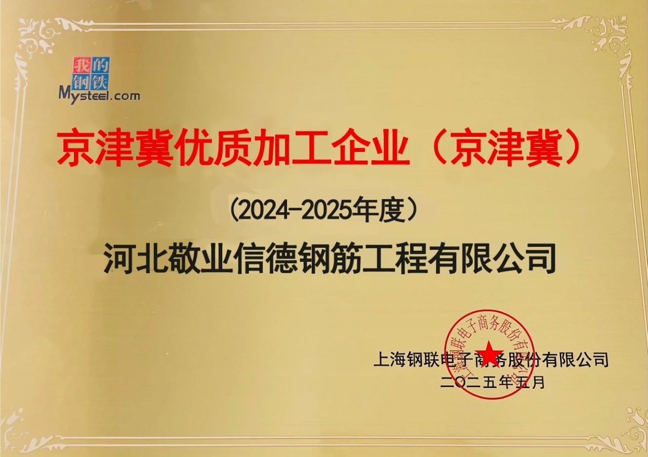憑借硬核的產(chǎn)品質(zhì)量與卓越的客戶服務(wù),信德鋼筋先后獲得“鋼鐵產(chǎn)業(yè)鏈發(fā)展功勛企業(yè)”“標(biāo)準(zhǔn)化工作示范企業(yè)”“企業(yè)信用評(píng)價(jià)AAA級(jí)信用企業(yè)”“2024-2025年度京津冀優(yōu)質(zhì)加工企業(yè)(京津冀)”等榮譽(yù)。
