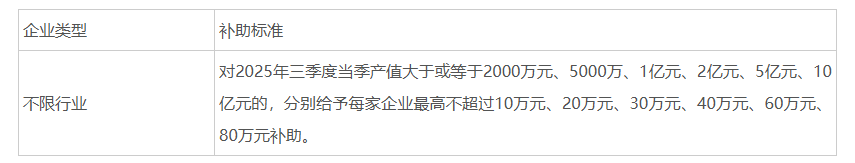 根據(jù)企業(yè)2025年三季度當(dāng)季產(chǎn)值、工業(yè)用電量、利潤總額、用工人數(shù)等指標(biāo)情況,分行業(yè)分類給予企業(yè)一定的資金獎(jiǎng)補(bǔ)(如下表),用于支持企業(yè)增加用工、采購生產(chǎn)物料、降低物流成本和加強(qiáng)安全生產(chǎn)等。注:以下各項(xiàng)不得重復(fù)申報(bào),補(bǔ)助標(biāo)準(zhǔn)為上限標(biāo)準(zhǔn)。
