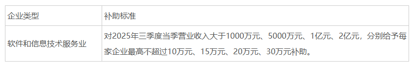 根據(jù)企業(yè)2025年三季度當(dāng)季營業(yè)收入等指標(biāo)情況,給予企業(yè)一定的資金獎(jiǎng)補(bǔ),用于支持企業(yè)增加用工、軟件開發(fā)、市場拓展及信息服務(wù)能力提升等。注:補(bǔ)助標(biāo)準(zhǔn)為上限標(biāo)準(zhǔn),補(bǔ)助金額可按照資金額度、政策效果等情況適當(dāng)調(diào)整。