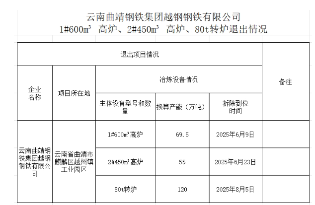 附件:云南曲靖鋼鐵集團越鋼鋼鐵有限公司1#600m³高爐、2#450m³高爐、80t轉爐退出情況