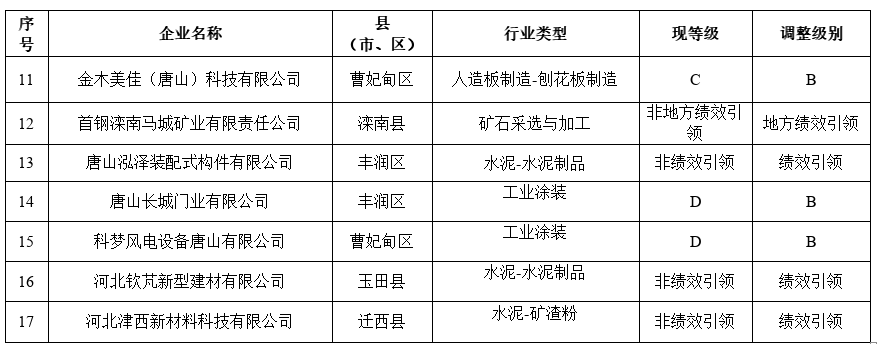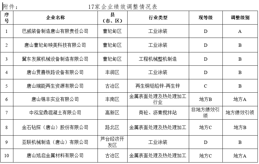 按照生態(tài)環(huán)境部《重污染天氣重點(diǎn)行業(yè)應(yīng)急減排措施制定技術(shù)指南》要求和《河北省重污染天氣重點(diǎn)行業(yè)企業(yè)績(jī)效評(píng)級(jí)管理辦法》規(guī)定,經(jīng)省生態(tài)環(huán)境廳審定,巴威裝備制造唐山有限責(zé)任公司等17家企業(yè)符合績(jī)效級(jí)別晉升要求,同意調(diào)整。調(diào)整情況詳見(jiàn)附表。
