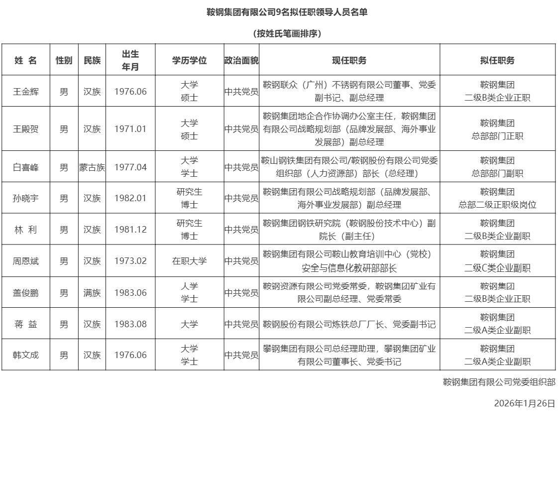 經(jīng)鞍鋼集團有限公司黨委研究決定,對9名擬任職領導人員面向全公司實施任前公示。公示期間,廣大職工對擬任職領導人員在德、能、勤、績、廉等方面的意見,可采取來信、來電、來訪等方式向鞍鋼集團黨委組織部反映。公示時間:2026年1月27日至2026年2月2日。