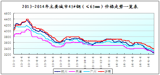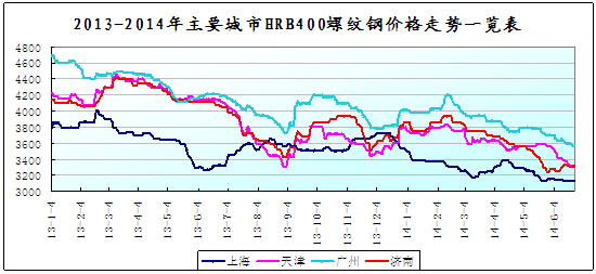 6月份國內(nèi)鋼市整體震蕩下滑,其中長材跌幅明顯。6月份,鋼材市場進(jìn)入需求淡季,高溫多雨工程施工受阻、制造業(yè)夏休增多,需求明顯減少;鋼材期貨弱勢難改,創(chuàng)出2009年上市以來新低;進(jìn)口鐵礦石價格大幅下滑,鋼廠成本支撐減弱,鋼材價格持續(xù)下跌;中下旬,隨著央行降準(zhǔn)及微調(diào)刺激政策陸續(xù)出臺,宏觀面利好消息對鋼價有所提振,現(xiàn)貨市場跌幅有所減緩。截止24日,山東省內(nèi)市場三級螺紋鋼價格3040-3060元/噸,較上月末下跌160元/噸;厚規(guī)格熱卷價格3300-3350元/噸,較上月末下跌10元/噸;中板價格3340-3400元/噸,較上月末下跌40-50元/噸;H型鋼中小規(guī)格價格3080-3110元/噸,普通大規(guī)格價格3030-3060元/噸,較上月末下跌70-100元/噸;45#鋼價格3360-3380元/噸,較上月末下跌90元/噸。