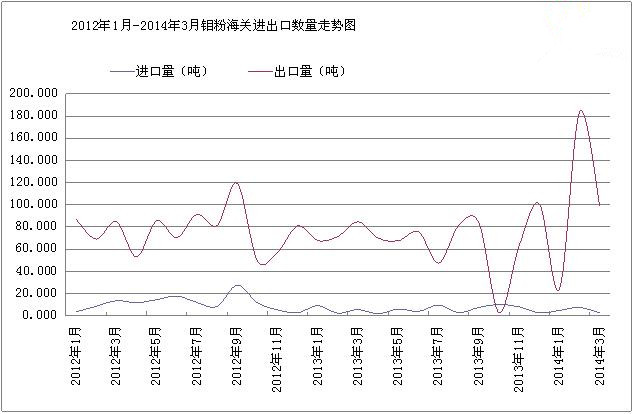 據(jù)海關(guān)數(shù)據(jù)顯示,2014年3月國內(nèi)進(jìn)口鉬粉2.423噸,較上月環(huán)比減少67.882%;出口鉬粉98.994噸,較上月環(huán)比減少46.12%。