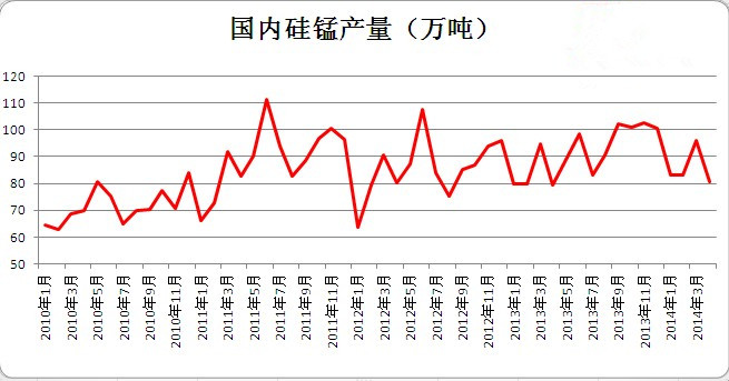 2014年4月國(guó)內(nèi)硅錳產(chǎn)量為80.78萬(wàn)噸,較之3月(95.9萬(wàn)噸)有所下降,較之2013年4月(78.58萬(wàn)噸)略有增加,2014年1-4月累積硅錳產(chǎn)量344.1萬(wàn)噸,較之2013年1-4月(330.7萬(wàn)噸)略增加。