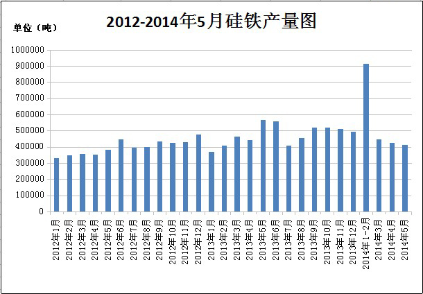 2014年5月我國鐵合金產(chǎn)量320.9萬噸同比增加28.43萬噸,1-5月國內(nèi)鐵合金累計產(chǎn)量為1561.67萬噸。2014年5月份我國硅鐵產(chǎn)量為41.23萬噸,環(huán)比4月份小幅減少1.48萬噸,其中寧夏7.57萬噸、青海8.38萬噸、甘肅3.69萬噸、內(nèi)蒙8.33萬噸。2014年1-5月份硅鐵產(chǎn)量為220.46萬噸,同比減少5.77萬噸。