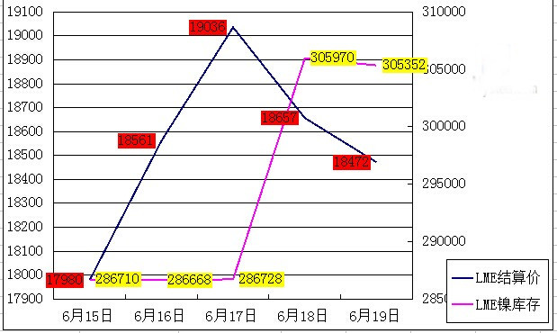從上圖可以看出,本周LME鎳處于一個震蕩略走強的趨勢,基本符合之前的預(yù)期。截止19日,倫鎳場內(nèi)收18545美元/公噸;結(jié)算價18472美元/公噸;倫鎳3收18571美元/公噸;庫存305352噸。值得一提的是,本周二受美國指數(shù)表現(xiàn)利好、加之中國銀行的降準(zhǔn)勢頭的影響,央行降準(zhǔn)意味著將向市場逆回購資金,有證券公司估計,本次定向降準(zhǔn)可釋放資金規(guī)模最高上限為2000億至2500億元。給金屬市場打了一劑強心針。LME鎳結(jié)算價一舉突破19000美元的關(guān)口。部分基金屬基本聞風(fēng)上漲。