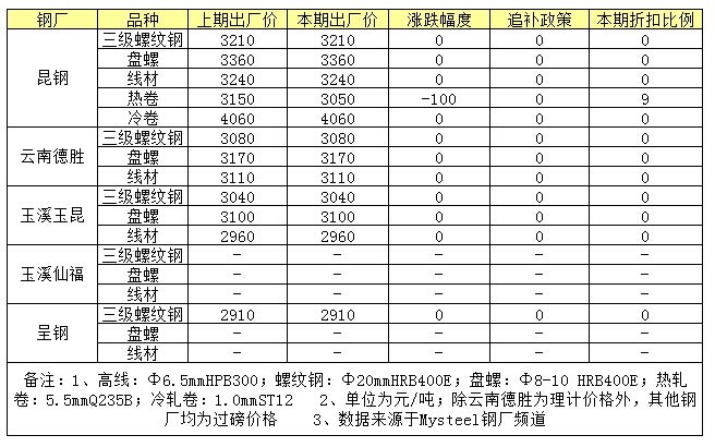 本周云南省本地建筑鋼材生產(chǎn)企業(yè)出廠價格政策均以穩(wěn)定為主;板材方面,昆鋼熱軋出廠價格本周下調(diào)100元/噸,降幅較大。