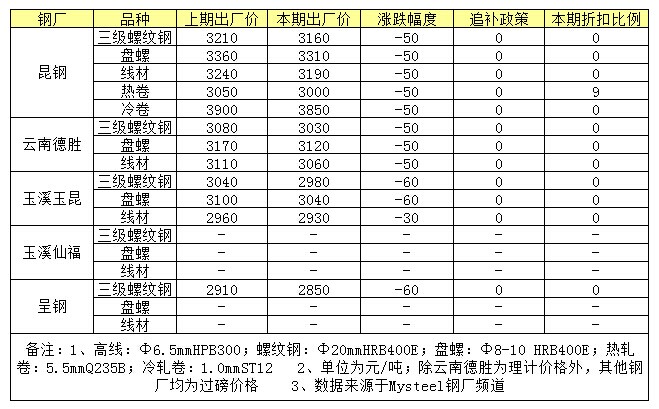本周云南省本地建筑鋼材生產(chǎn)企業(yè)出廠價(jià)格政策全線下調(diào),其中建筑鋼材價(jià)格下調(diào)30-60元/噸,板材下調(diào)幅度在50元/噸。