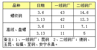 昆鋼本部安寧公司650棒材生產(chǎn)線生產(chǎn)不正常,日影響螺紋鋼產(chǎn)量0.2萬噸/天;昆鋼玉鋼1#450m³高爐檢修,影響鐵水產(chǎn)量0.4萬噸/天;昆鋼紅鋼1#450m³高爐檢修,影響鐵水產(chǎn)量0.2萬噸/天。玉溪仙福4座小高爐停產(chǎn)檢修以及棒材生產(chǎn)線限產(chǎn),達(dá)產(chǎn)率在60%左右;曲靖呈鋼1#450m³高爐檢修,影響鐵水產(chǎn)量0.4萬噸/天;玉溪玉昆1380m³高爐檢修,鐵水不足,處于不飽和生產(chǎn)。值得一提的是3月12日昆鋼玉鋼2#450m³高爐檢修完畢,恢復(fù)生產(chǎn)。