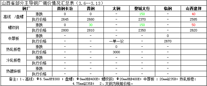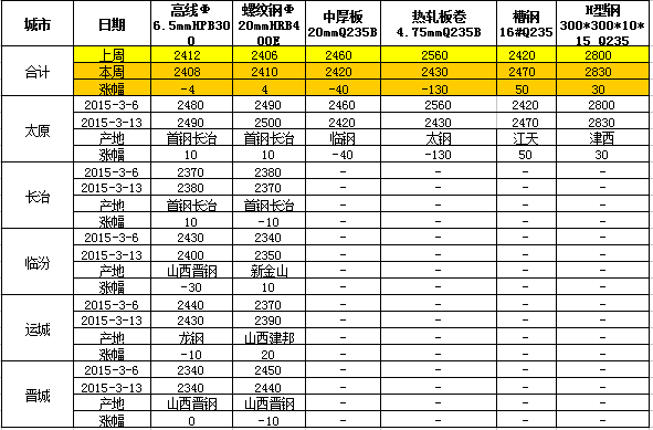 建材方面:本周,山西省內各市場建材價格先跌后漲,市場螺紋鋼均價較上周上漲4元/噸。從本周市場商戶反饋得知,市場本周成交量稍有放量,大戶保持每日500-800噸出貨量,由于天氣轉暖,工地相繼開工,需求量小量釋放,但資金仍舊緊張,多數(shù)項目仍處停工狀態(tài)。而受本周四唐山方坯拉漲、北京建材大漲影響,市場久跌氛圍打破,商戶積極拉漲價格,市場成交量較年前明顯增加。此次拉漲多屬前期虧損過多,市場壓抑過久,商戶自發(fā)拉漲,而部分鋼廠也因近期檢修,廠內庫存有限,適時拉漲價格。下周市場若繼續(xù)保持高成交量,價格應以穩(wěn)為主。