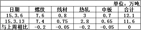 建筑鋼材庫存為8.15萬噸,較上周下降0.25萬噸。本周市場保持少量出貨量,直至周四北京市場拉漲影響,本地市場出貨量明顯上漲,現(xiàn)貨庫存得到一定消耗而下降;