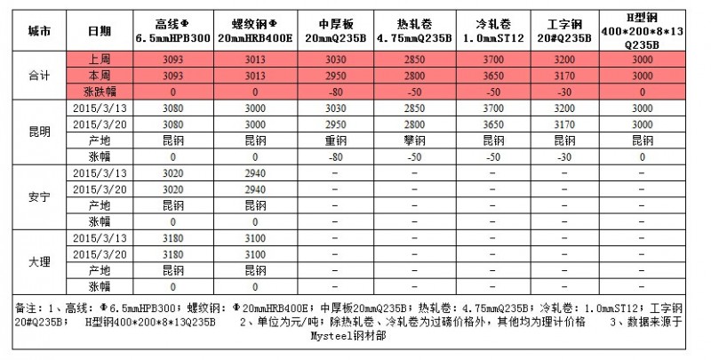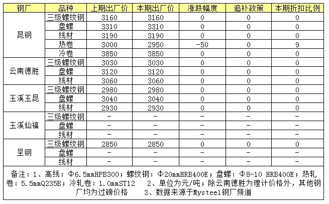 本周云南省本地建筑鋼材生產(chǎn)企業(yè)出廠價格政策均以穩(wěn)定為主;而板材方面,昆鋼熱軋板卷出廠價格下調(diào)50元/噸。