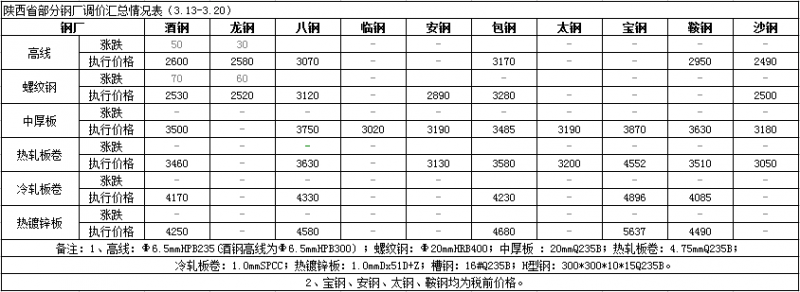 表3:陜西省部分主導鋼廠調(diào)價情況匯總表