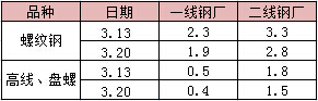 四川省鋼廠建材可銷售總庫存為6.6萬噸,較3月13日減少了1.3萬噸。其中螺紋鋼可銷售總庫存截止到目前為止為4.7萬噸,較上周螺紋鋼總庫存對比減少了0.9萬噸。而通過分析看出,目前一線、二線鋼廠庫存量總體均小幅減少。高線、盤螺可銷售總庫存截止到目前為止為1.9萬噸,與上周高線、盤螺總庫存相比小幅減少。大廠高線、盤螺生產(chǎn)基本停滯,二線鋼廠正常生產(chǎn),相對來說近期盤螺資源庫存占比依然較高。