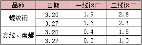 四川省鋼廠建材可銷售總庫存為5.9萬噸,較3月20日減少了0.7萬噸。其中螺紋鋼可銷售總庫存截止到目前為止為4.3萬噸,較上周螺紋鋼總庫存對比減少了0.4萬噸。而通過分析看出,目前一線、二線鋼廠庫存量總體均小幅減少。高線、盤螺可銷售總庫存截止到目前為止為1.6萬噸,與上周高線、盤螺總庫存相比小幅減少。大廠高線、盤螺生產(chǎn)依舊不飽和,二線鋼廠生產(chǎn)正常,相對來說近期盤螺資源庫存占比依然較高。