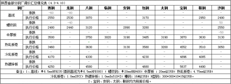 表3:陜西省部分主導鋼廠調(diào)價情況匯總表