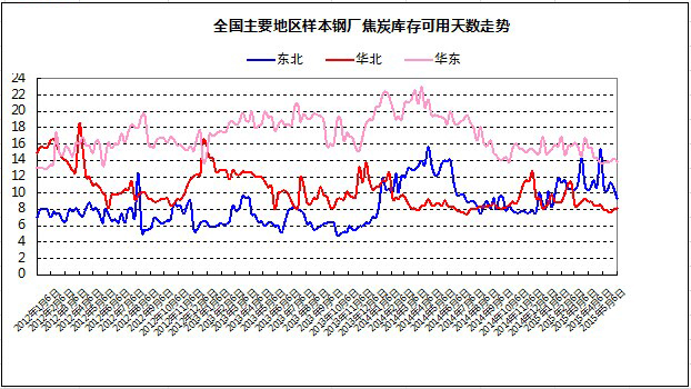 圖1:全國主要地區(qū)樣本鋼廠焦炭庫存天數(shù)走勢