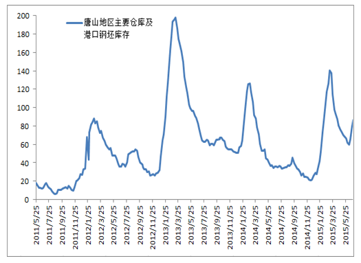 圖3唐山地區(qū)主要倉庫及港口鋼坯庫存走勢圖