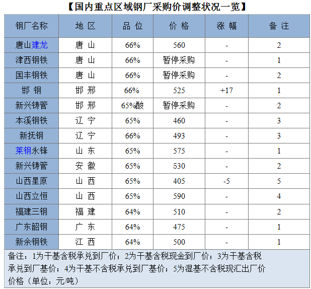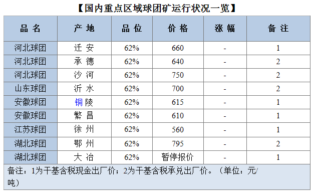 一、國內(nèi)各地區(qū)元鐵精粉干基含稅現(xiàn)金出廠價為噸,遷安地區(qū)為噸;承德地區(qū)鐵精粉市場價格亦有所上漲,漲幅為噸。由于本周螺紋鋼價格漲勢過猛,幾乎達到峰值,接下來不會再漲,以及本周邯邢、張家口等地區(qū)鐵精粉市場小幅上揚。各地區(qū)成交一般。邯邢市場鐵精粉價格小幅上調(diào)了堿鐵精粉小幅上漲至噸;預計下周仍會持續(xù)上漲趨勢。北京市場元,目前穩(wěn)定在在噸。張家口市場鐵精粉主流價格維持在元元。由于外礦指數(shù)的穩(wěn)中趨漲,內(nèi)礦價格及鋼廠采購價也有一定程度的攀升,外礦對內(nèi)礦的積極影響較為明顯。此外,由于九月初的,北京的部分礦山將會進行停產(chǎn)檢修;邯邢的部分鋼廠也會有一定的減產(chǎn),不過持續(xù)時間不長。預計后市仍會有小幅上漲。本周遼西、遼東及黑龍江吉林地區(qū)鐵精粉市場持續(xù)盤整,區(qū)域鐵精粉價格與上周持平,成交一般。大部分鋼廠壓價采購,庫存持續(xù)低位,區(qū)域性成交偏淡。部分地區(qū)鋼價漲幅【華東市場】本周華東市場整體持穩(wěn)。元【中南地區(qū)】本周中南地區(qū)鐵精粉市場弱穩(wěn)鐵精粉干基含稅出廠主流價位保持噸;湖北大冶元干基不含稅現(xiàn)金出廠價在噸,再次提價。受前期外礦回復影響,內(nèi)礦有所漲勢,但并未對停產(chǎn)礦山有明顯激勵。內(nèi)陸礦山盼漲心切,預計下周國產(chǎn)礦市場仍會有小幅回升。